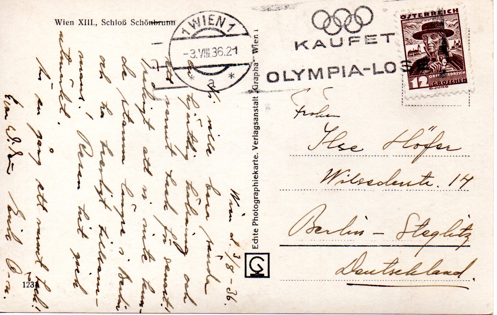 P Rakousko OH 1936 Berlin, SR 3.8.1936 WIEN 1 KAUFET OLYMPIA-LOSE a olympijskými kruhy nad textem, výpl.známka 12 Gr, kvalita 445