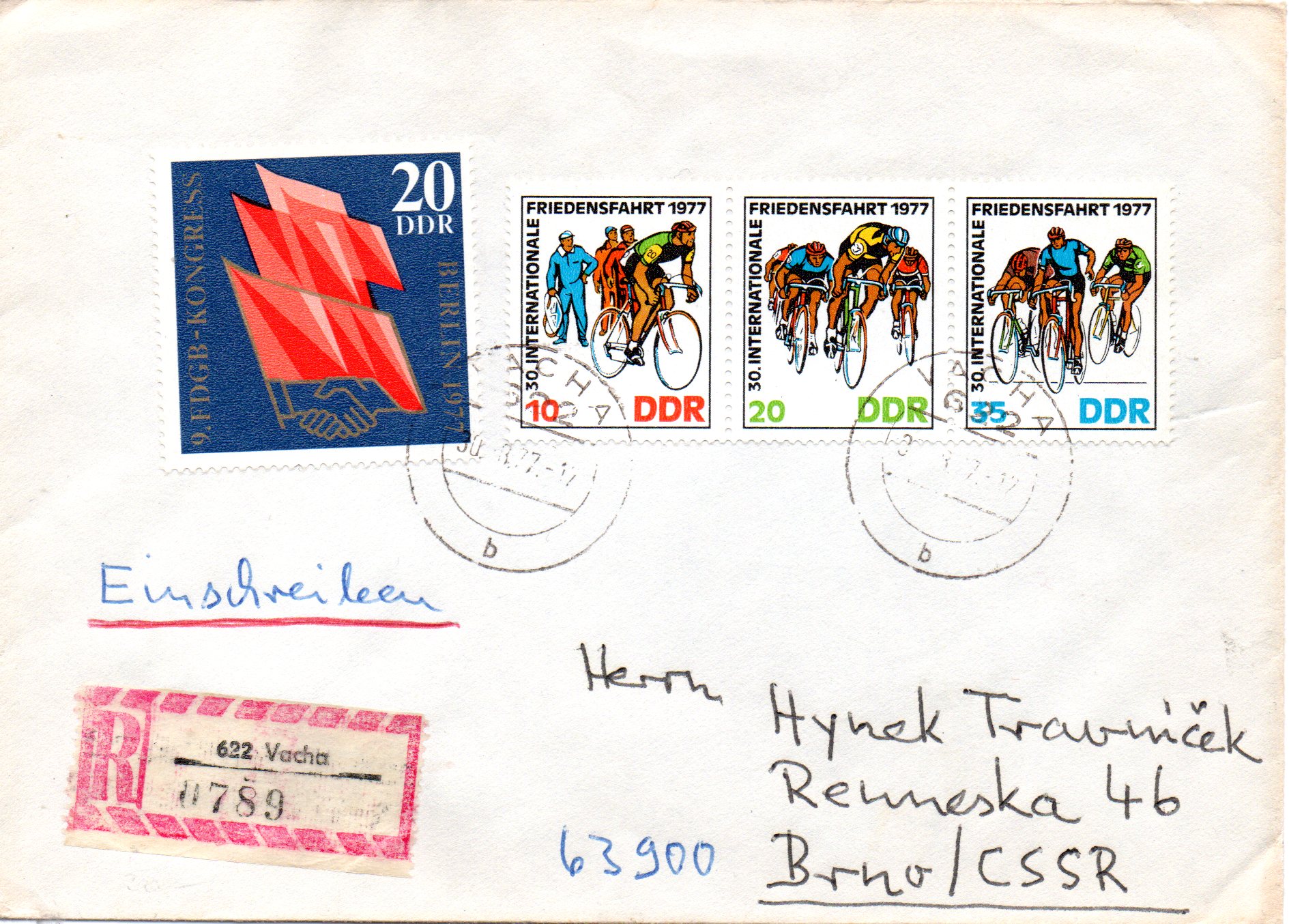 O NDR, 30.ročník Závodu míru 1977, série 3 zn. DDR, prošlé poštou R do Brna, kvalita 445