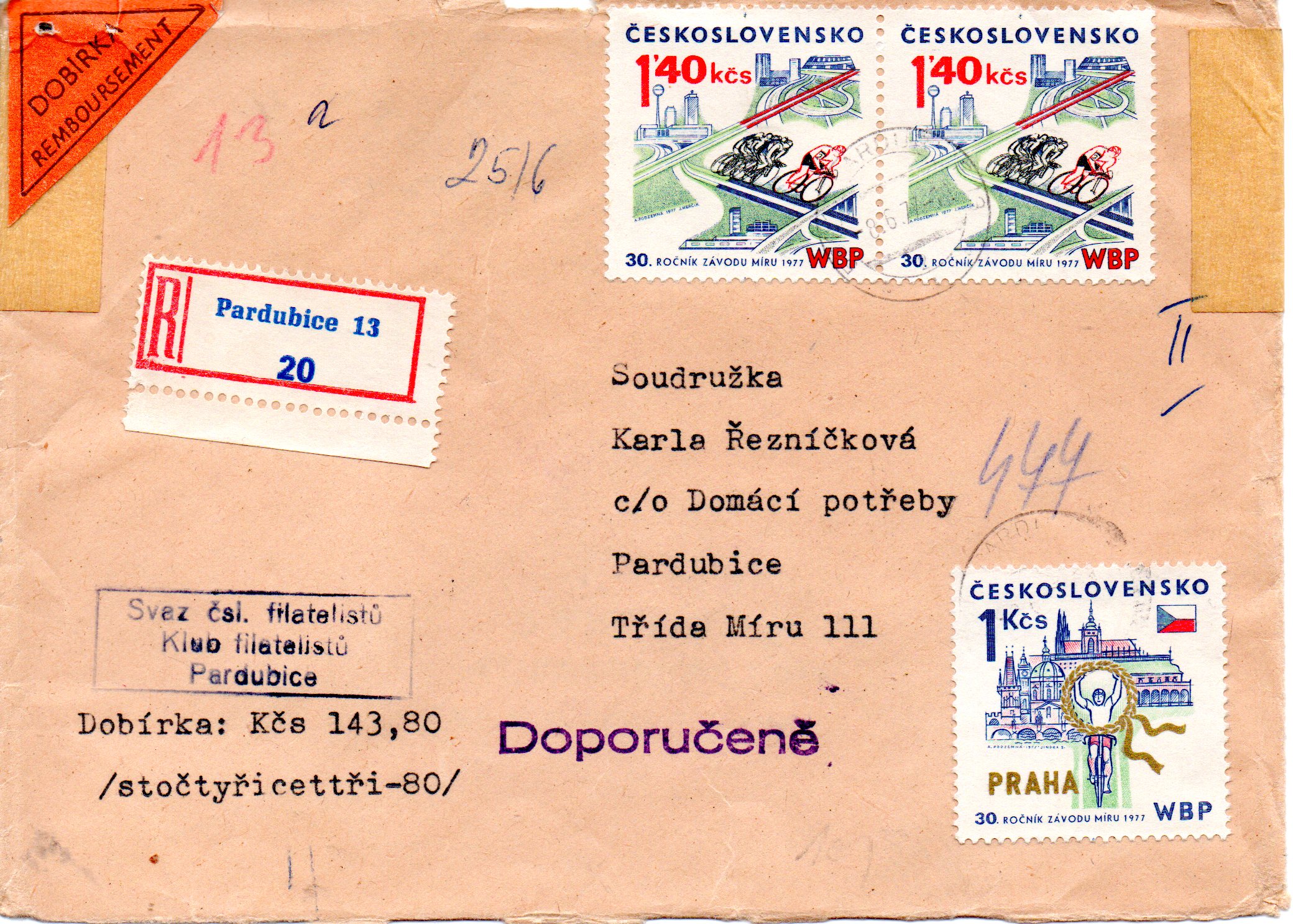 O Československo, 30.ročník Mez.závodu míru , frankovaná 3 zn. k závodu, zaslaná R do Pardubic, kvalita 335