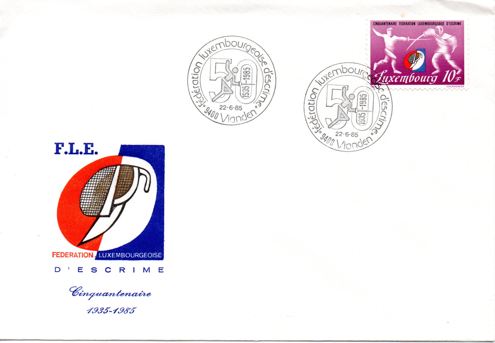 FDC Lucembursko, PR 22.6.1985 VIANDEN féderationluxembourgeoise d´scrime 1935-1985 s obrázkem šermíře (50.výročí šermířského svazu šermování), zn. 10 F, kvalita 555